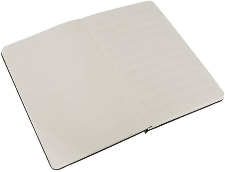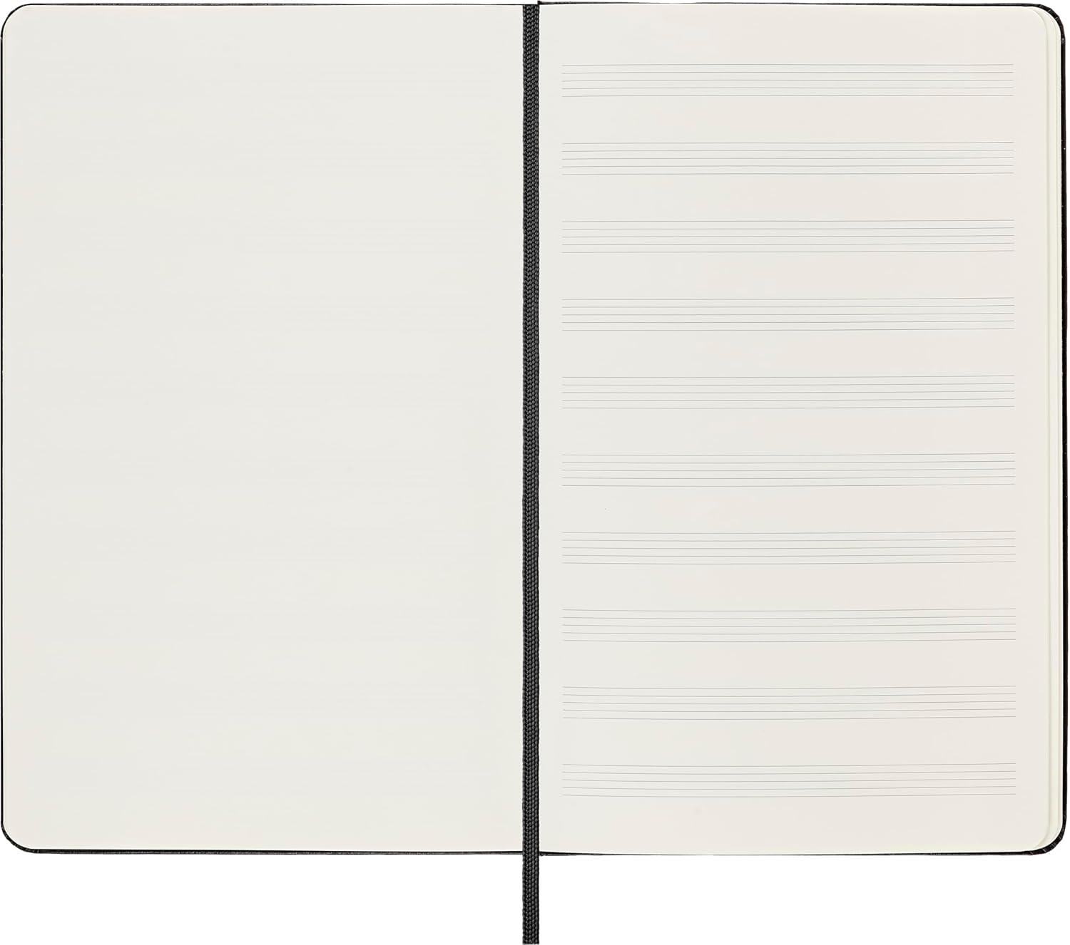 The Moleskine large Music notebook is ideal for musicians, sound designers and song writers. It has the left page blank and the pentagram on the right, perfect for jotting down harmonies, melodies and musical ideas.Every Moleskine product is thread bound and has a cardboard bound cover with rounded corners, acid free paper, a bookmark, an elastic closure and an expandable inner pocket that contains the Moleskine history.