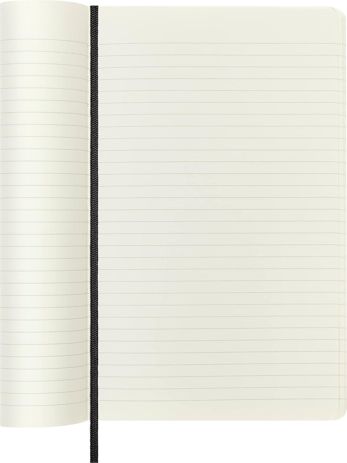 “The Soft Cover large notebook with ruled pages has a flexible yet sturdy cover that adapts to the movements of the body and fits comfortably in any pocket. This is a reliable travel companion, perfect for writings, thoughts and passing notes. Every Moleskine product is thread bound and has a soft cover with rounded corners, acid free paper, a bookmark, an elastic closure and an expandable inner pocket that contains the Moleskine history. Specifications: – Layout: Ruled Paper- Dimensions: 5″” x 8-1/4″”- Soft Cover with elastic closure and bookmark ribbon.- Color: Black- Pages: 192- Paper Weight: 70 gsm/47 lb.; FSC Certified Paper; Acid-Free (pH Neutral)- Internal Accordion Pocket name=””Comparison_Chart””>Moleskine Notebook & Journals Comparison Series Classic Notebooks Evernote Smart Notebooks Classic Notebooks – Reporter Volant Notebooks Cahier Notebooks Brief Description The Moleskine icon. Always at the ready, these thread-bound classic notebooks capture your thoughts, drafts, sketches, notes, appointments, contacts, or anything else you choose. Write, sketch, or draw in the specially designed Evernote Notebooks by Moleskine. Take a photo of any page in this Moleskine notebook with the Evernote Page Camera and it instantly becomes digital so that you can save it, search it and share it with the world. The Moleskine Pocket Ruled Reporter notebook has a cover that flip opens at the top, detachable pages at the back for quick notes on the spot and can be used both horizontally and vertically. A colored collection of soft cover notebooks and journals ideal for everyday use. Volant notebooks come packed in sets of two, consisting of two different shades of the same colour. It's a notebook so lightweight you'll forget about it – until you need it. The journals for day-to-day use, Cahier notebooks each have a heavy duty cardboard cover with visible stitching on the spine that matches the cover color. Slim, soft and light – Cahier journals suit any occasion, and come packaged in sets of three. Size X-Small, Pocket, Large, X-Large Pocket, Large Pocket, Large Pocket, Large Pocket, Large, X-Large Format Hard cover, Soft cover Hard cover Hard cover, Soft cover Soft cover (Sets of 2) Soft cover (Sets of 3) Black “”://./dp/886613712X/ref=Bks_NotebookClassic_BLK_Plain_XsmHrd””>XS Plain Hard cover, “”://./dp/8866137081/ref=Bks_NotebookClassic_BLK_Ruled_XsmHrd””>XS Ruled Hard cover, “”://./dp/8883701038/ref=Bks_NotebookClassic_BLK_Plain_PktHrd””>Pkt Plain Hard cover, “”://./dp/8883707141/ref=Bks_NotebookClassic_BLK_Plain_PktSft””>Pkt Plain Soft cover, “”://./dp/8883701003/ref=Bks_NotebookClassic_BLK_Ruled_PktHrd””>Pkt Ruled Hard cover, “”://./dp/8883707109/ref=Bks_NotebookClassic_BLK_Ruled_PktSft””>Pkt Ruled Soft cover, “”://./dp/888370102X/ref=Bks_NotebookClassic_BLK_Squared_PktHrd””>Pkt Squared Hard cover, “”://./dp/8883707125/ref=Bks_NotebookClassic_BLK_Squared_PktHrd””>Pkt Squared Soft cover, “”://./dp/8883701143/ref=Bks_NotebookClassic_BLK_Plain_LgHrd””>LG Plain Hard cover, “”://./dp/8883707206/ref=Bks_NotebookClassic_BLK_Plain_LgSft””>LG Plain Soft cover, “”://./dp/8883701127/ref=Bks_NotebookClassic_BLK_Ruled_LgHrd””>LG Ruled Hard cover, “”://./dp/8883707168/ref=Bks_NotebookClassic_BLK_Ruled_LgSft””>LG Ruled Soft cover, “”://./dp/8883701135/ref=Bks_NotebookClassic_BLK_Squared_LgHrd””>LG Squared Hard cover, “”://./dp/8883707184/ref=Bks_NotebookClassic_BLK_Squared_LgSft””>LG Squared Soft cover, “”://./dp/8883707265/ref=Bks_NotebookClassic_BLK_Plain_XLgSft””>XL Plain Soft cover, “”://./dp/8883707222/ref=Bks_NotebookClassic_BLK_Ruled_XLgSft””>XL Ruled Soft cover, “”://./dp/8883707249/ref=Bks_NotebookClassic_BLK_Ruled_XLgSft””>XL Squared Soft cover “”://./dp/886613760X/ref=Bks_Evernote_BLK_Ruled_PktHrd””>Pkt Ruled Hard cover, “”://./dp/8866137626/ref=Bks_Evernote_BLK_Ruled_PktHrd””>Pkt Squared Hard cover, “”://./dp/8866137618/ref=Bks_Evernote_BLK_Ruled_LgHrd””>LG Ruled Hard cover, “”://./dp/8866137634/ref=Bks_Evernote_BLK_Squared_LgtHrd””>LG Squared Hard cover “”://./dp/8883705505/ref=Bks_Reporter_BLK_Plain_PktHrd””>Pkt Plain Hard cover, “”://./dp/8862932987/ref=Bks_Reporter_BLK_Plain_PktSft””>Pkt Plain Soft cover, “”://./dp/8883705483/ref=Bks_Reporter_BLK_Ruled_PktHrd””>Pkt Ruled Hard cover, “”://./dp/8862934661/ref=Bks_Reporter_BLK_Ruled_PktSft””>Pkt Ruled Soft cover, “”://./dp/8883705491/ref=Bks_Reporter_BLK_Squared_PktHrd””>Pkt Squared Hard cover, “”://./dp/8862932979/ref=Bks_Reporter_BLK_Squared_PktSft””>Pkt Squared Soft cover, “”://./dp/888370553X/ref=Bks_Reporter_BLK_Plain_LgHrd””>LG Plain Hard cover, “”://./dp/8862933029/ref=Bks_Reporter_BLK_Plain_LgSft””>LG Plain Soft cover, “”://./dp/8883705513/ref=Bks_Reporter_BLK_Ruled_LgHrd””>LG Ruled Hard cover, “”://./dp/8862933002/ref=Bks_Reporter_BLK_Ruled_LgSft””>LG Ruled Soft cover, “”://./dp/8883705521/ref=Bks_Reporter_BLK_Squared_LgHrd””>LG Squared Hard cover, “”://./dp/8862933010/ref=Bks_Reporter_BLK_Squared_LgSft””>LG Squared Soft cover “”://./dp/8867320459/ref=Bks_Volant_BLK_Plain_XsmSft””>XS Plain Soft Cover, “”://./dp/8867320432/ref=Bks_Volant_BLK_Ruled_XsmSft””>XS Ruled Soft cover, “”://./dp/8867320491/ref=Bks_Volant_BLK_Plain_PktSft””>Pkt Plain Soft cover, “”://./dp/8867320475/ref=Bks_Volant_BLK_Ruled_PktSft””>Pkt Ruled Soft cover, “”://./dp/886732053X/ref=Bks_Volant_BLK_Plain_LgSf