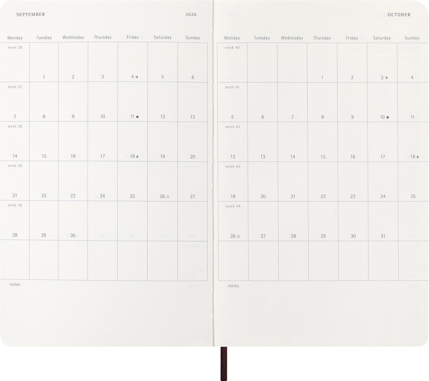 This 12-month planner runs from January to December 2026 and has a practical weekly notebook layout shown across each two-page spread. The lefthand page displays the days of the week while the righthand page offers ample space for jotting down notes, reminders, and musings. This unique layout effortlessly combines the functionality of a planner with the flexibility of a notebook, making it your perfect companion for 2026.